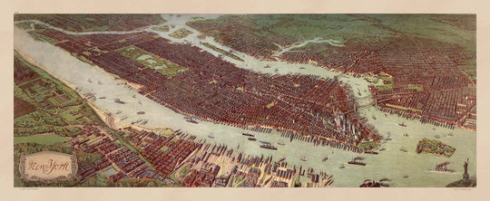 La Estatua de la Libertad se encuentra en la esquina inferior derecha del mapa, mirando hacia la ciudad de Nueva York.