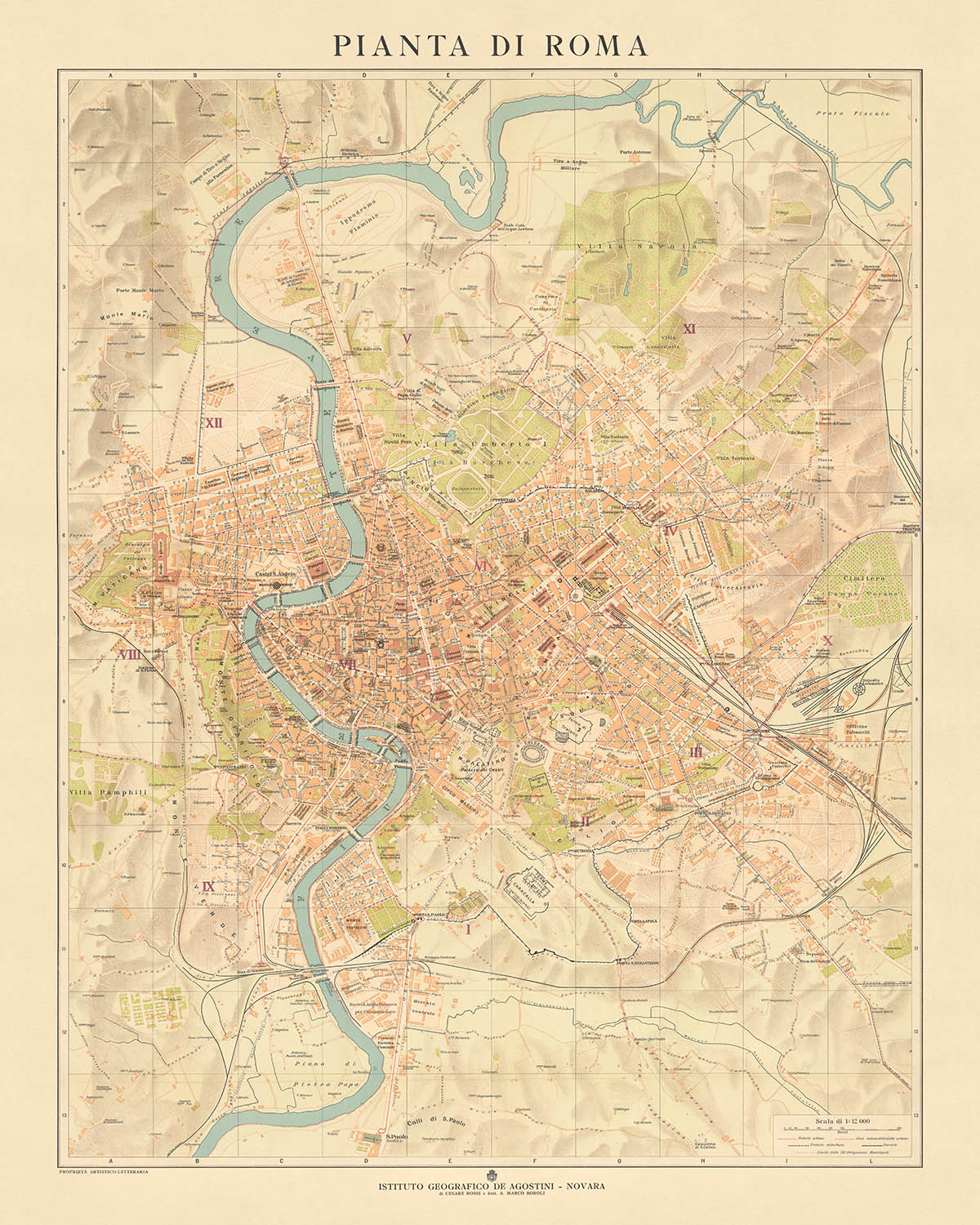 Sumérgete en la grandeza histórica de Roma con la "Pianta di Roma", un mapa de calles meticulosamente detallado creado por el renombrado Istituto Geografico De Agostini en 1921. Este mapa captura a Roma en un período de transformación, retratando no solo los monumentos antiguos que han definido la ciudad durante milenios, sino también las modernas calles y barrios que le dan a Roma su vibrante carácter vivo. Desde el corazón espiritual y administrativo del Vaticano en el oeste hasta los bulliciosos y académicos barrios alrededor de Campo Verano en el este, este mapa ofrece una vista completa de Roma, encapsulando su doble identidad como ciudad antigua y capital contemporánea.