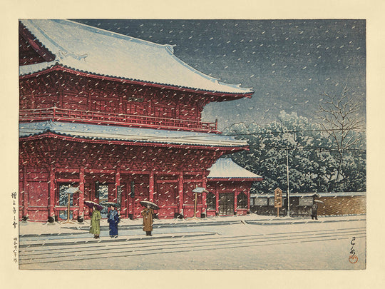 Descubre la belleza atemporal de "Nieve en el Templo Zojoji en Tokio" de Hasui Kawase, una obra maestra excepcional de 1935 que captura el espíritu tranquilo de la tradición ukiyo-e de Japón. Conocida como 増上寺の雪 (Zojoji no Yuki) en japonés, esta icónica impresión en madera encapsula el esplendor sereno del Templo Zojoji cubierto por una suave nevada, una escena impregnada de calma poética y gracia arquitectónica. Hasui Kawase, celebrado como una figura clave del movimiento shin-hanga ("nuevas impresiones"), dedicó su carrera a reimaginar los paisajes japoneses con colores luminosos, atmósferas suaves y evocadores estados de ánimo estacionales.