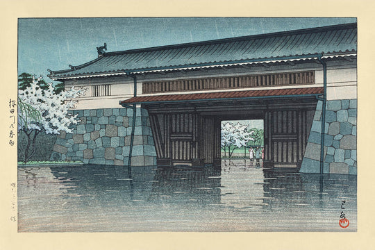 Sumérgete en el atractivo tranquilo de "Lluvia de Primavera en la Puerta Sakurada, Tokio" del célebre artista japonés Hasui Kawase. Creada originalmente en 1935 y titulada en japonés como "Sakuradamon no Harusame" (桜田門の春雨), esta icónica impresión en madera invita al espectador a la poesía silenciosa de un día lluvioso de primavera en Tokio. Kawase, ampliamente considerado un maestro del movimiento shin-hanga (“nuevas impresiones”), es conocido por sus evocadores paisajes, que combinan bellamente técnicas tradicionales de ukiyo-e con influencias impresionistas para capturar el estado de ánimo y la atmósfera del Japón de principios del siglo XX.