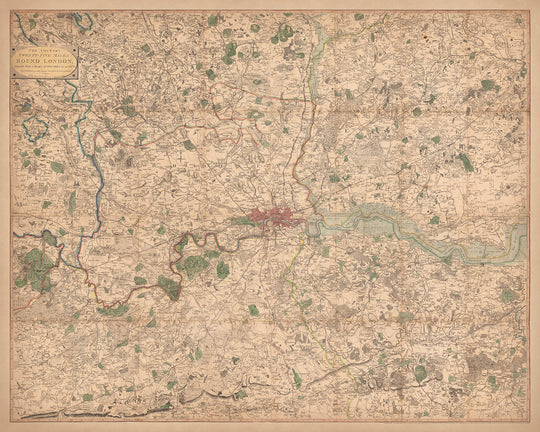 Este gran mapa, de W. Faden en 1790, es uno de los mayores mapas históricos de Londres. Inusual para los mapas de su época, este también incluye todos los suburbios de Londres hasta 25 millas alrededor.