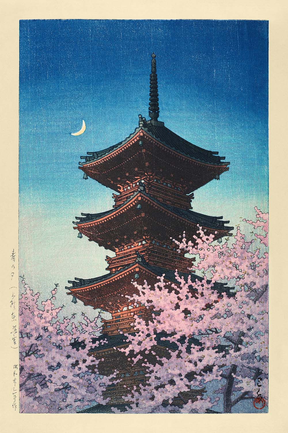 Santuario Toshogu y Cerezos en Flor al Anochecer de Primavera por Hasui Kawase 1935