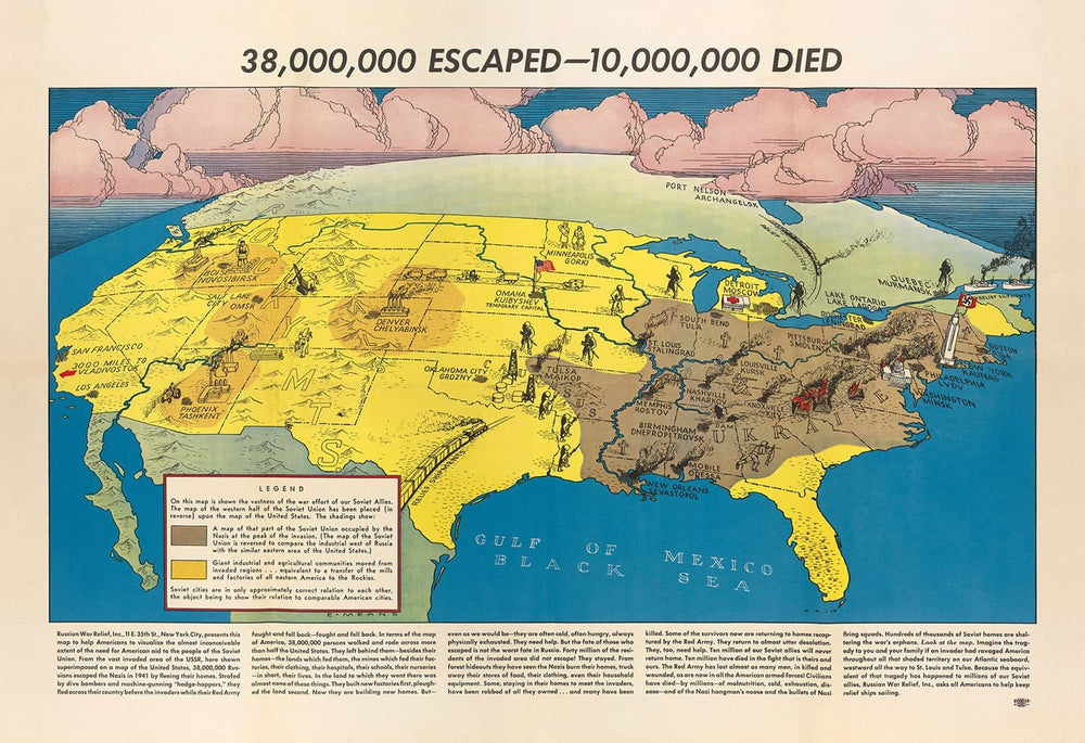 El mapa muestra Rusia superpuesta sobre los EE. UU., con Moscú en Detroit, y Ucrania cubriendo la mayor parte de la costa este de EE. UU. Minsk está en Washington D.C, Lviv está en Filadelfia, y Smolensk está en Pittsburgh. Escalofriantemente, una bandera nazi ondea desde el Empire State Building. El título del mapa, "38,000,000 escaparon - 10,000,000 murieron" se refiere a los refugiados desplazados por la invasión nazi.