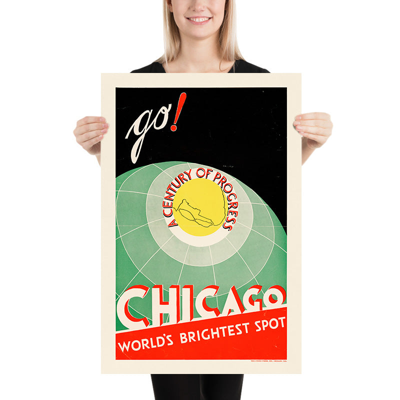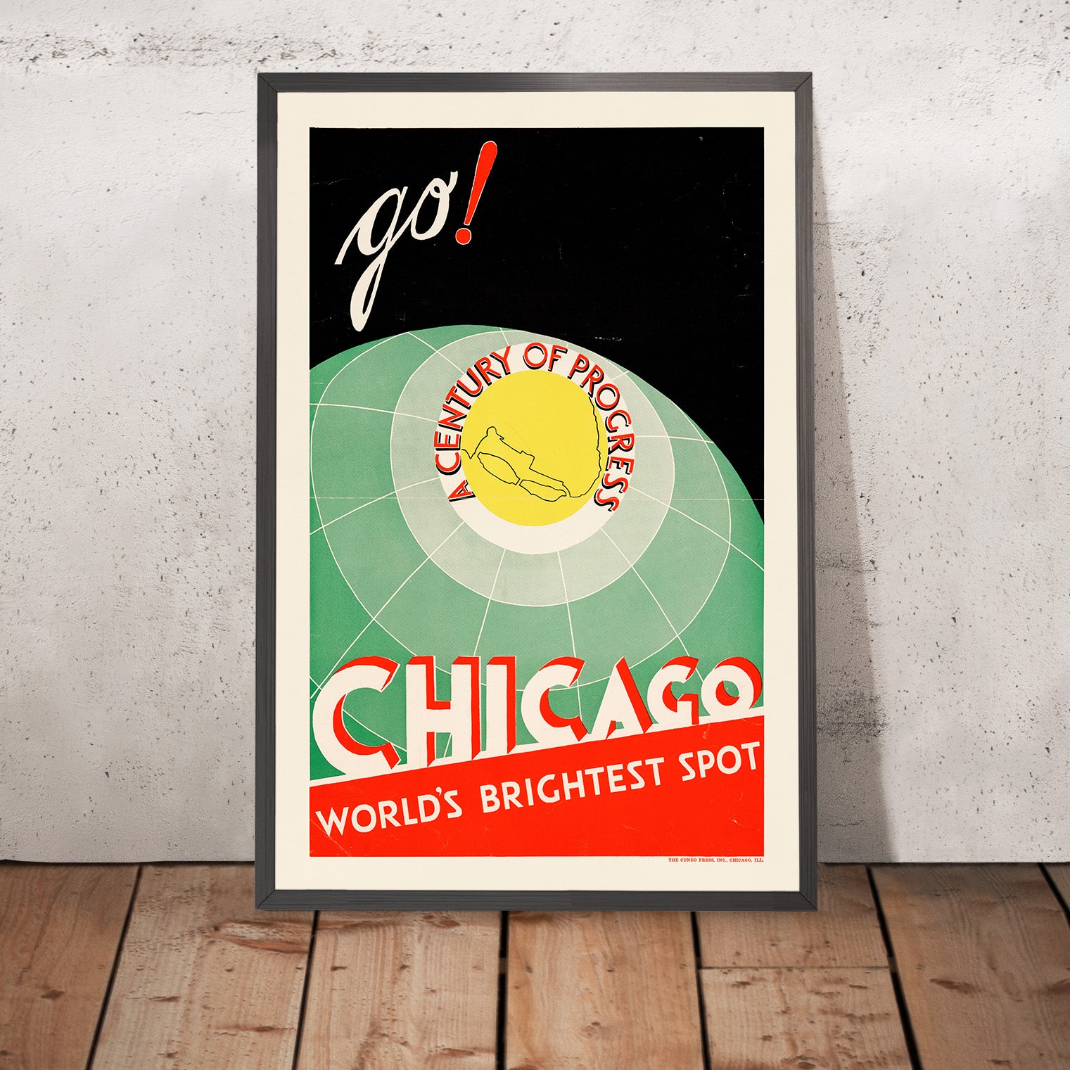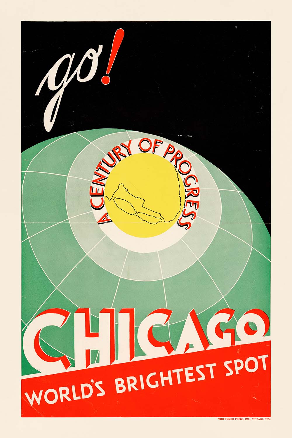 “Chicago. World’s Brightest Spot. Go!” is a vibrant 1933 travel poster created for the A Century of Progress International Exposition. The composition urges the viewer forward with a handwritten “go!” in cream, punctuated by a scarlet exclamation point against a deep black sky. Below, a sea‑green globe with crisp meridians centers a yellow medallion ringed with the words “A CENTURY OF PROGRESS,” while a bold red diagonal at the base declares “CHICAGO – WORLD’S BRIGHTEST SPOT.” In the lower margin the credit reads “THE CUNEO PRESS, INC., CHICAGO, ILL.” — placing this piece firmly in the heart of Midwestern print history.