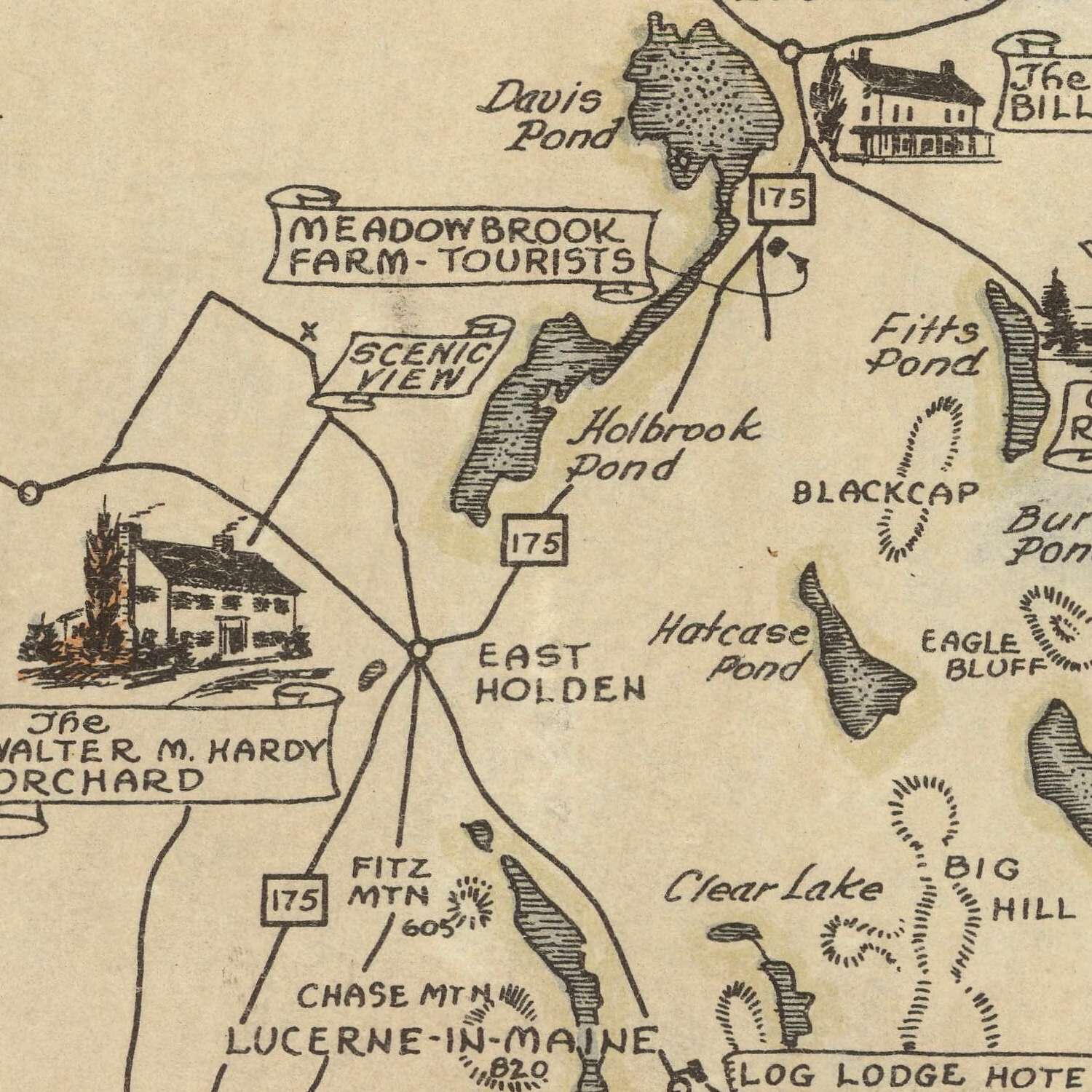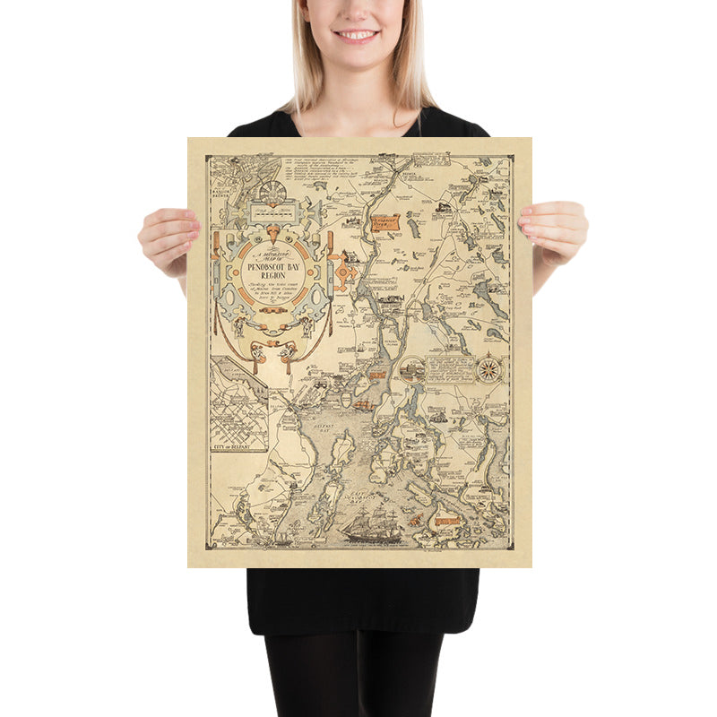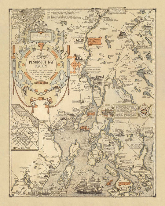 A Decorative Map of Penobscot Bay Region, created by Luther S. Phillips in 1940, celebrates Maine’s storied coast from Camden to Blue Hill and from Islesboro to Bangor. Conceived as a county-and-state pictorial map with thematic depth, it braids navigational clarity with artistic flourish. North stands crisp at the top beneath a decorative compass rose, while a highly ornate cartouche frames the region’s essentials and lends a heraldic gravitas. Across the water, an illustrated sailing vessel salutes centuries of maritime enterprise, its wake threading among named islands and harbors. Every component is intentional: place-names are carefully lettered, shorelines are sculpted with an engraver’s poise, and annotations hover like marginalia, inviting close reading. This is a map to explore as much as consult.