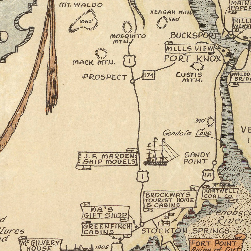 Old Pictorial Map of Penobscot Bay, Maine by Phillips 1940: Bangor, Camden, Belfast, Blue Hill, US 1