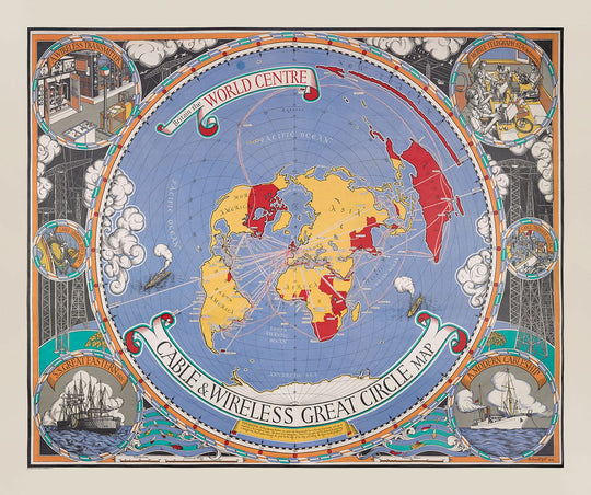 Mapa del Gran Círculo de Old Cable & Wireless, 1945 por Max Gill: Mapa de la Red Submarina del Imperio Británico de la Tierra Plana