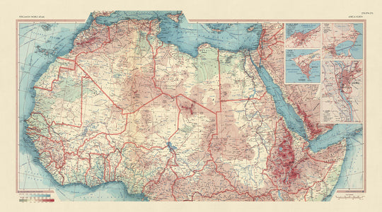 'África - Norte' es una exquisita pieza de arte cartográfico, publicada originalmente en 1967 por el Servicio de Topografía del Ejército Polaco. Como un mapa político y físico detallado, es una representación intrincada de África del Norte y del Oeste, proporcionando una cautivadora instantánea de la región durante mediados del siglo XX. Este mapa va más allá de meros detalles geográficos para abarcar el rico tapiz histórico y cultural de la región. Contiene insets de ciudades significativas como Ed Dar El Beida (Casablanca), Dakar, El Qahira (El Cairo) y Tounis (Túnez), cada una representada con meticulosa atención al detalle. El mapa también cubre cada país en África al norte del 5º paralelo norte, proporcionando una visión general completa de la región.