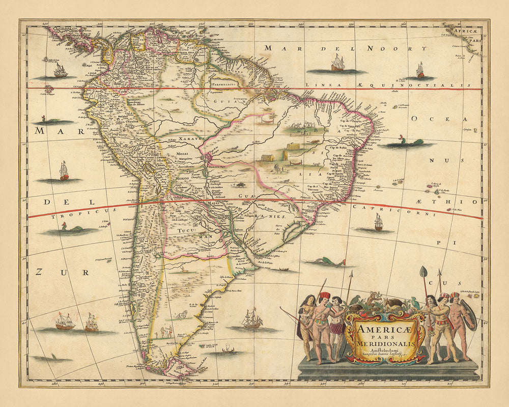 El mapa presenta ciudades destacadas como Brasilia y Buenos Aires, junto con lugares destacados como las Islas Malvinas y las Islas Galápagos. La vasta extensión de la selva amazónica también está bellamente representada, ofreciendo una visión de la rica biodiversidad que caracteriza a esta parte del mundo. Cada ciudad, punto de referencia y región está meticulosamente detallada, lo que refleja el compromiso de Visscher con la precisión y su excepcional talento artístico.