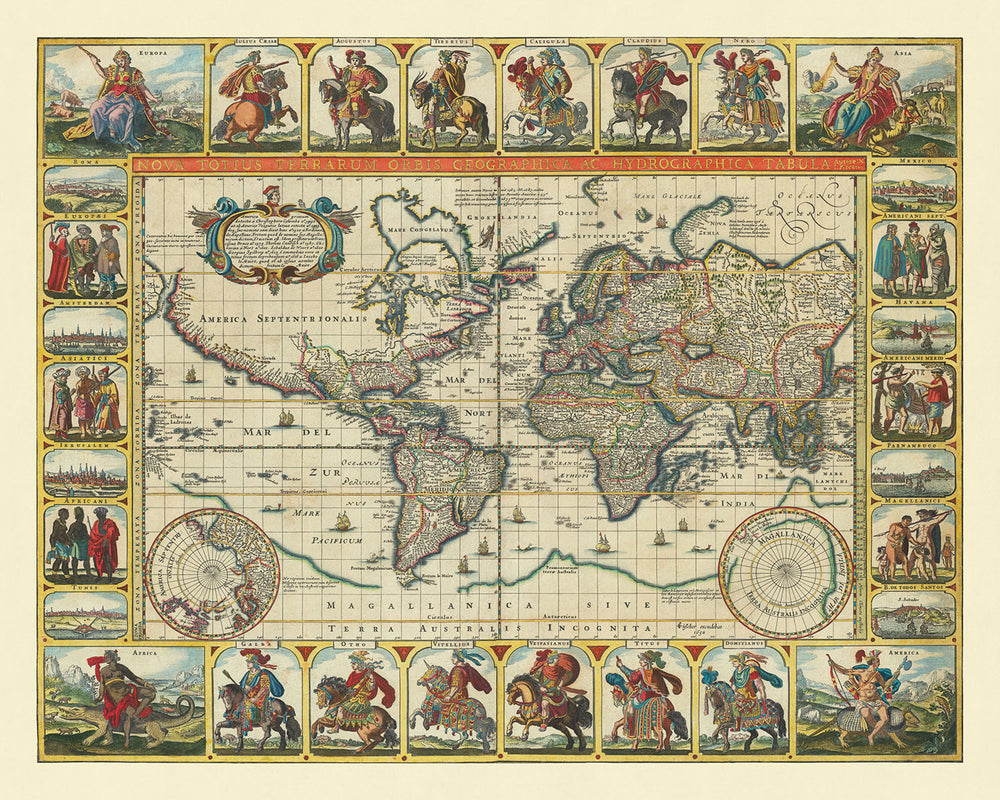 El diseño y estilo del mapa son un festín para los ojos, caracterizados por su grabado a mano coloreado que da vida al paisaje político del siglo XVII. La Nova Totius Terrarum Orbis está adornada con bordes elaborados y viñetas que narran el mundo más allá de la mera geografía. La inclusión de los Doce Césares, emperadores romanos montados en los bordes decorativos, infunde al mapa un sentido de profundidad histórica y grandeza. Estos emperadores, cada uno representado en elaborados trajes de armadura, sirven como guardianes del conocimiento del mundo antiguo, supervisando un mapa que es tanto una declaración política como geográfica.