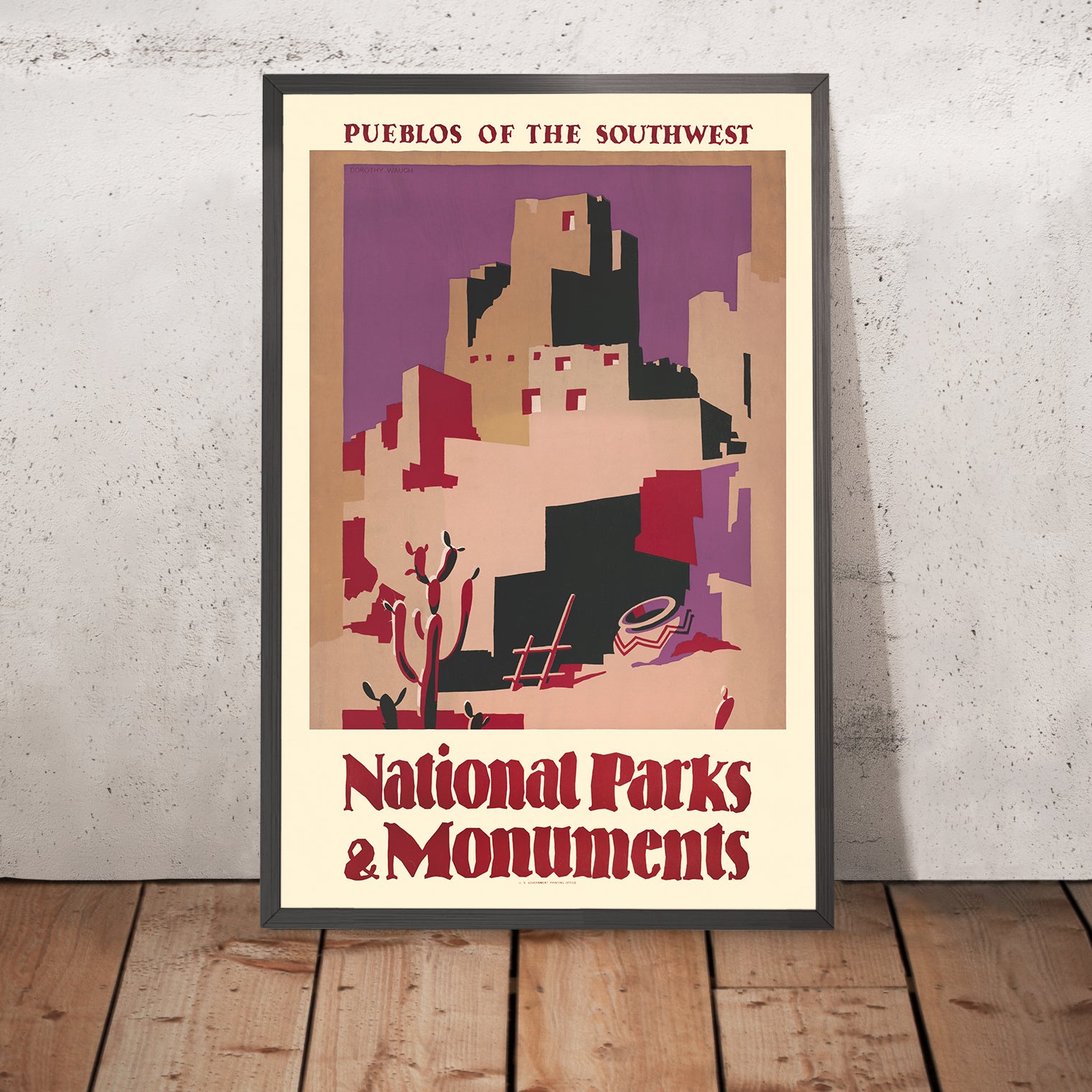 National Parks and Monuments: Pueblos of the Southwest by Dorothy Waugh (1930) is a striking modernist travel poster that celebrates the architecture and cultural heritage of the American Southwest. Created at a moment when the United States was championing its parks and monuments, Waugh’s design merges bold graphics with a sense of place—stylized adobe pueblos rise in geometric tiers while desert plant silhouettes ground the scene in the arid landscape of New Mexico and Arizona. The result is both an invitation to explore and a tribute to the enduring presence of Indigenous communities whose architectural forms shape the region’s visual identity.