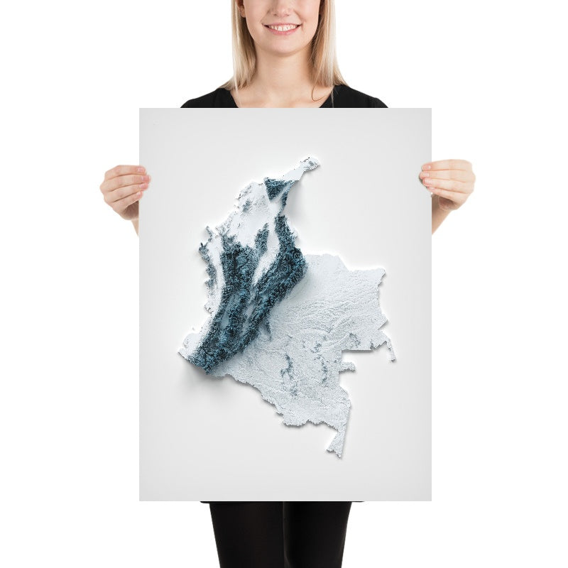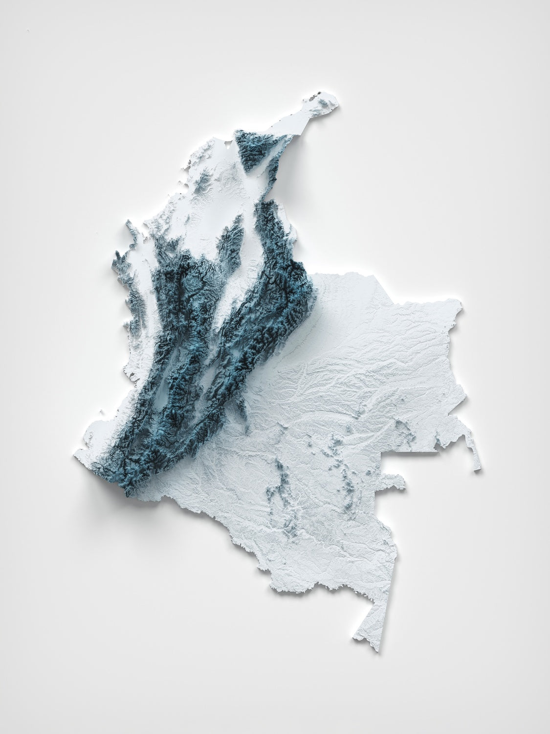 This is a minimalist topographical relief map of Colombia, created by The Unique Maps Co. and finished with our signature Unique 3D process. There are no labels, no roads, and no towns — just the sculpted landforms of a country where mountains break into river valleys, high plateaus step down to endless plains, and an isolated coastal massif towers above the sea. Soft highlights skim the crests and summits, while deep shadows fall into canyons and basins, letting you read Colombia’s terrain at a glance.