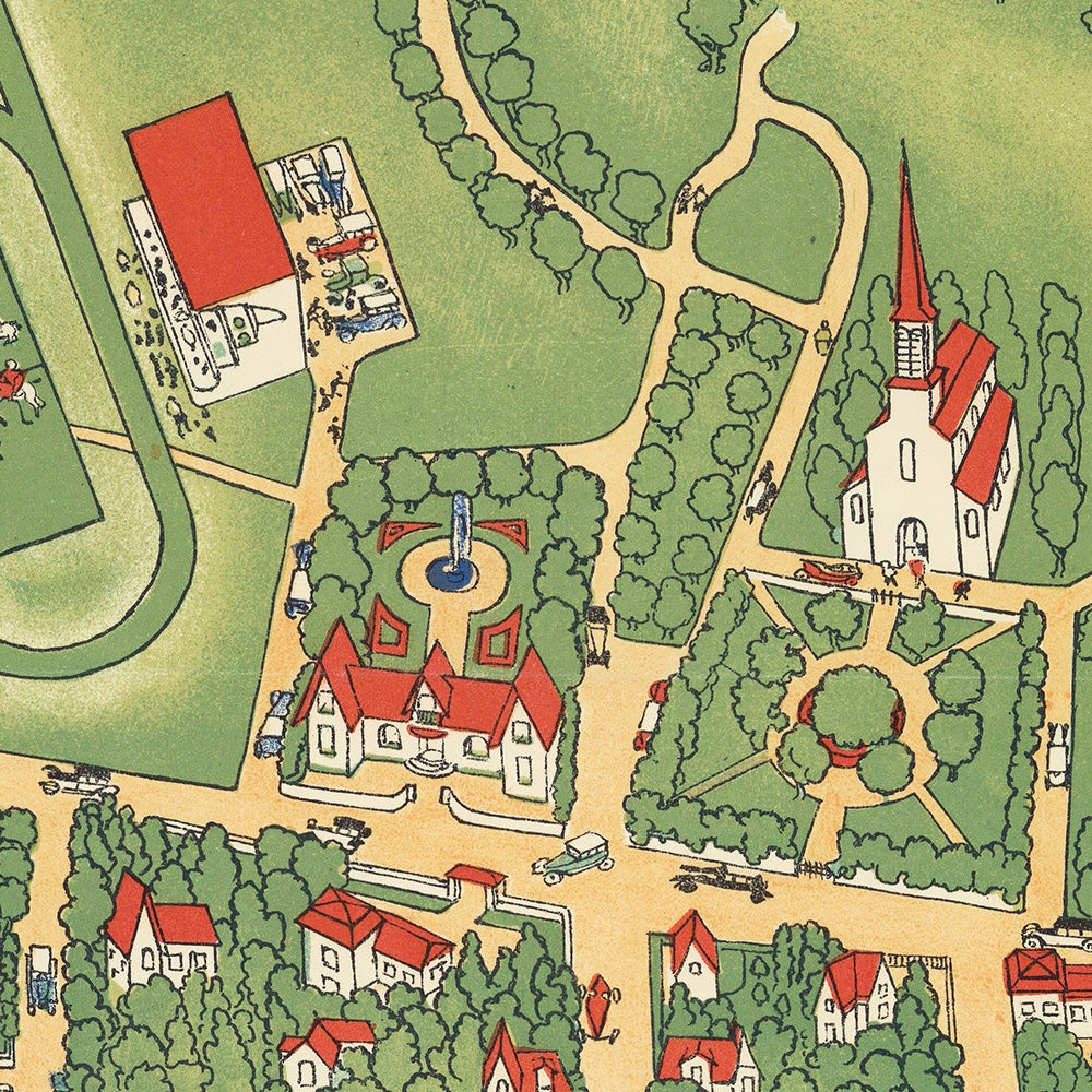 In visual terms, the composition exemplifies Art Deco clarity: broad planes of color, simplified silhouettes, and typography that feels at once architectural and airy. The greens set a resort mood—suggesting manicured promenades or racecourse turf—while the cool blues and creamy neutrals keep the scene breezy and refined. That small pop of red enlivens the whole, making the print read beautifully from across a room and lending just enough drama for a focal wall.