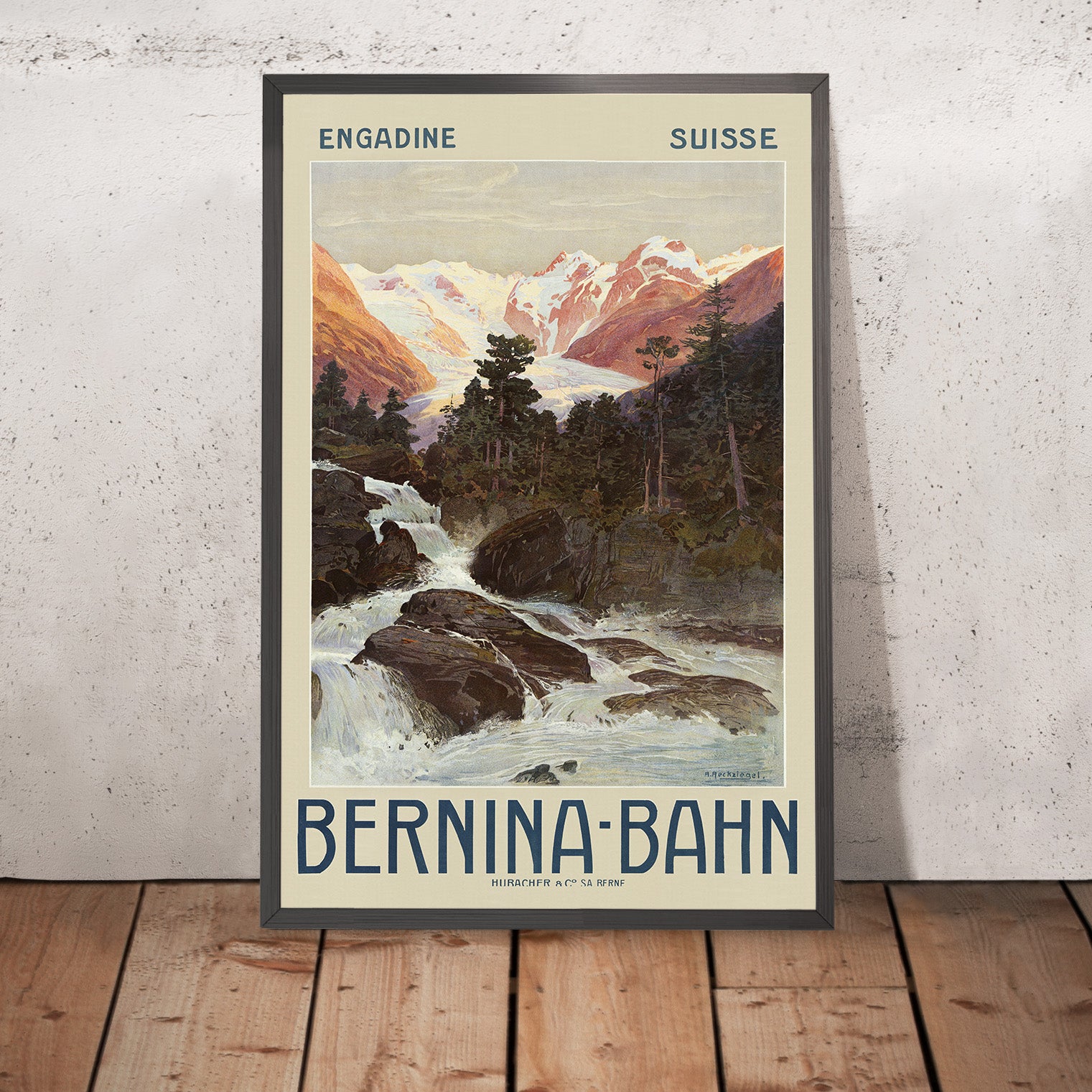 Visually, the print is a masterclass in alpine poster art. The white of the snowfields and glaciers reads as luminous and expansive, offset by deep green woods and stony, umber slopes that anchor the composition. The typography “Bernina-Bahn – Engadin, Suisse” integrates seamlessly with the landscape, giving the poster a strong graphic presence that suits both vintage-inspired and modern interiors. As wall art, it offers an evocative window onto the Engadin—ideal for anyone who loves grand scenery, alpine sport, or historic rail travel.
