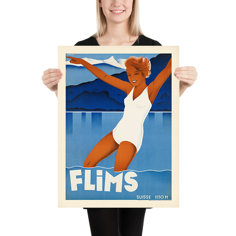 Flims is a classic Art Deco travel poster celebrating the Swiss alpine resort of Flims in the canton of Graubünden—here attributed to an anonymous designer working in the golden age of European poster art. Created in the interwar era when mountain destinations were promoted for fresh air and vigorous leisure, the artwork captures the upbeat spirit of travel between the 1920s and 1930s. Flims, known for its crystalline lakes, forested trails and airy plateau above the Rhine Gorge, became a beacon for hikers, swimmers and sunseekers as well as winter sports enthusiasts—an allure that still resonates today.