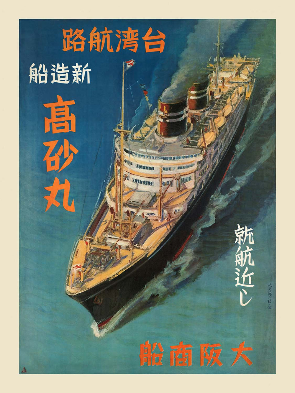 “Newly built vessel Takasago Maru in service from Japan to Taiwan” is a striking early 20th-century travel poster created in the Art Deco idiom by an anonymous commercial illustrator. It captures a proud moment in maritime history: the launch of a modern passenger ship on the important sea route linking Japan and Taiwan. With bold Japanese titling and a composition that celebrates speed, scale, and confidence, the poster distills the optimism of an era when ocean liners symbolized technological progress and cosmopolitan adventure.