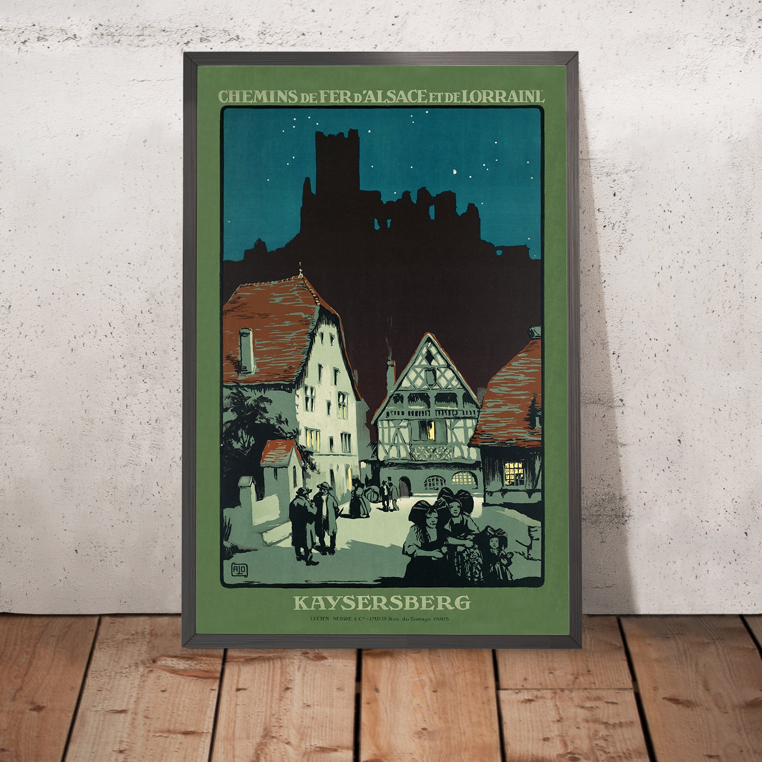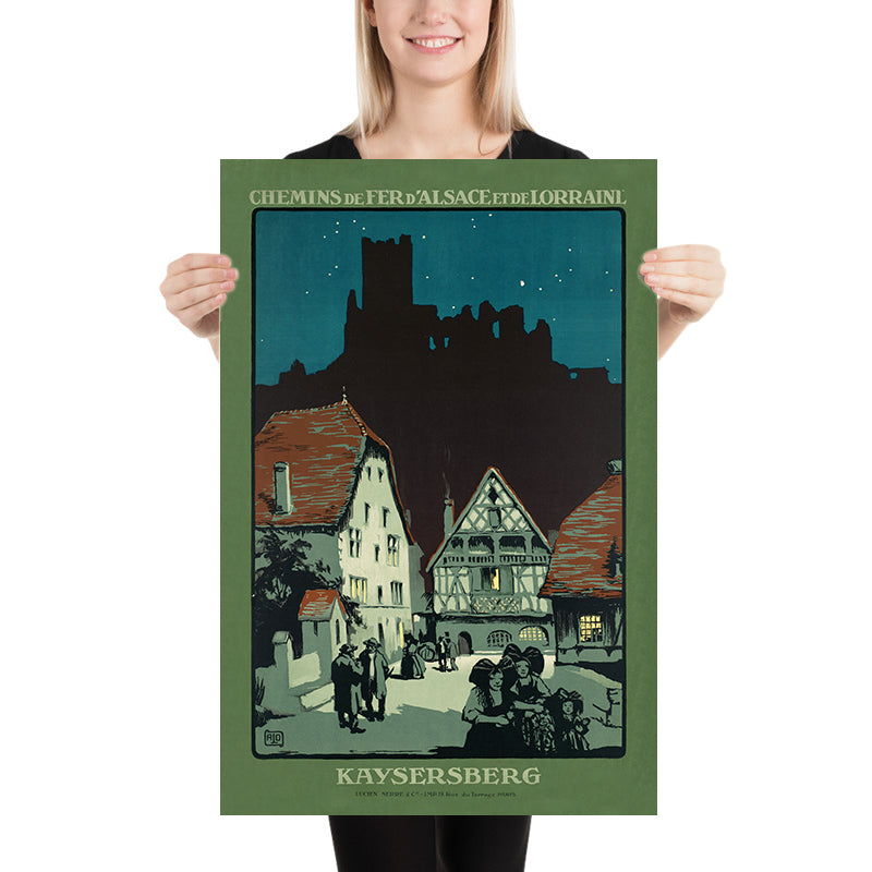 Though the designer is uncredited, the poster bears the hallmarks of early 20th-century railway advertising in Alsace, where elegant, silhouette-driven graphics and hand-rendered lettering elevated regional landmarks to icons. Kaysersberg, cradled between the Vosges foothills and vineyard-laced slopes, was a natural subject: its cobbled streets, half-timbered façades, and the castle on the Schlossberg formed a ready-made stage for romantic travel narratives.