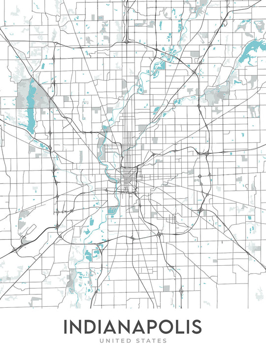 Este mapa de Indianápolis, Indiana, es un callejero moderno y detallado sin etiquetas. El mapa se centra en la ciudad de Indianápolis y sus alrededores, proporcionando una representación precisa y visualmente atractiva del diseño de la ciudad. El mapa cubre un área rectangular que se extiende aproximadamente 25 millas de norte a sur y 21 millas de este a oeste, y abarca varios vecindarios, ciudades, carreteras principales y puntos de referencia.