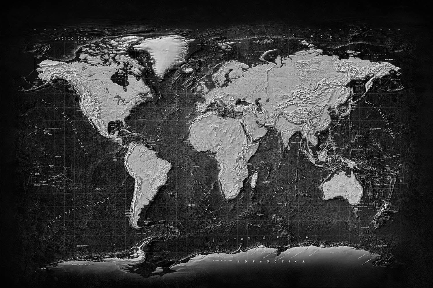 Industrial Style World Map by Ray&Co is a contemporary cartographic tour de force: a global portrait that fuses precise political boundaries with finely rendered physical geography. True to the studio’s reputation for marrying aesthetics and utility, the map sets a monochromatic, industrial palette against exquisitely crisp country outlines and meticulously labeled major cities. Across the world’s oceans, a raised 3D bathymetric texture adds visual depth and a sense of motion, drawing the eye from continental shelves to abyssal plains. This is a map designed to be read and admired—an elegant synthesis where clarity, restraint, and information density coexist, and where the present-day geopolitical landscape is framed within an arresting, modern design language.