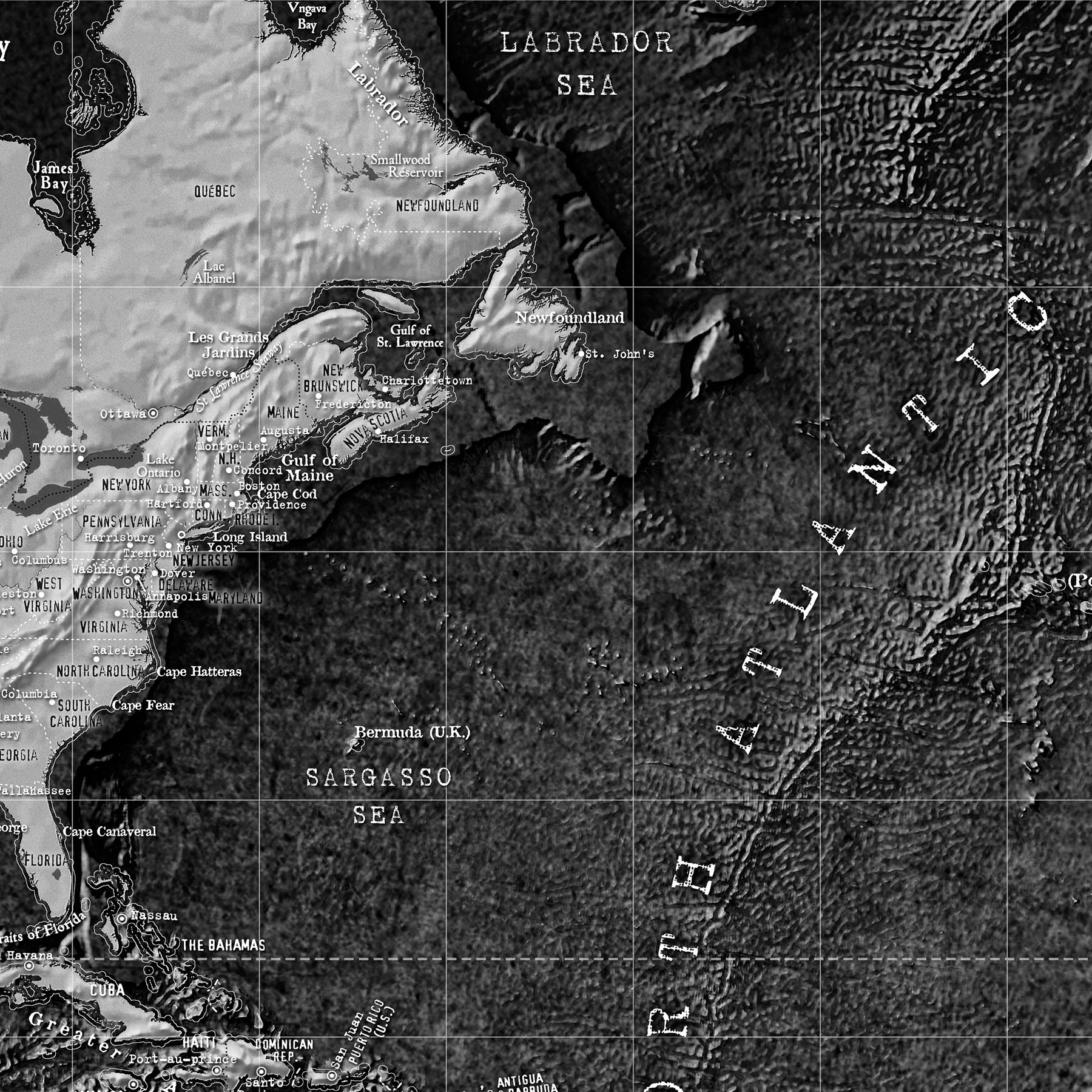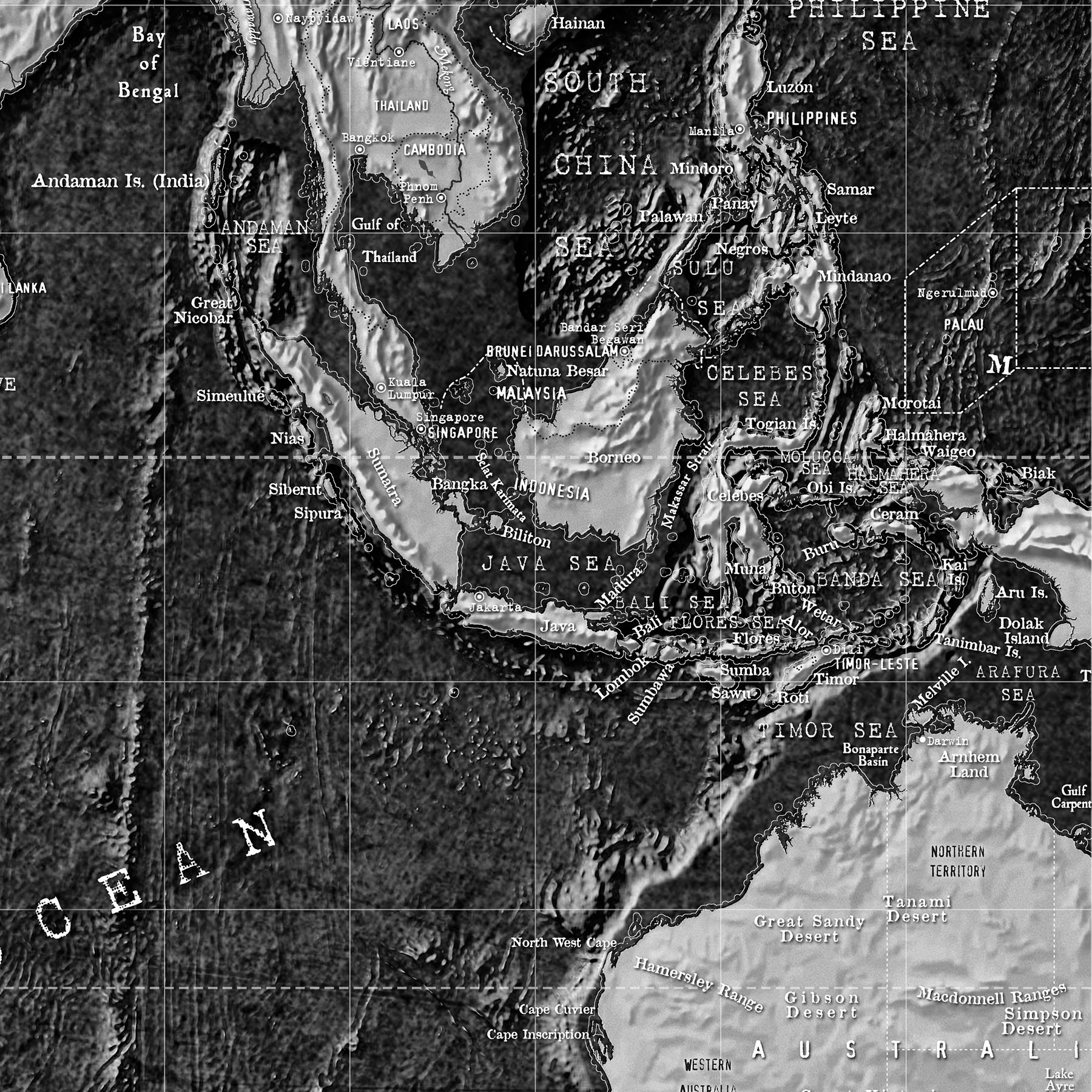 Physical geography receives equal prominence, delivered with an editorial intelligence that avoids clutter. Major rivers weave across the continents in clean, purposeful lines, emphasizing the hydrographic skeleton that underpins human settlement. Noteworthy features such as the Plateau of Tibet, the Alps, and the West Siberian Plain are called out with unobtrusive labels that sit comfortably within the monochrome field. Mountain ranges remain deliberately unnamed, a design choice that grants the relief shading and landforms room to breathe. Beneath the world’s oceans, the 3D-rendered bathymetry captures trenches, ridges, and continental margins with sculptural subtlety, inviting extended study.