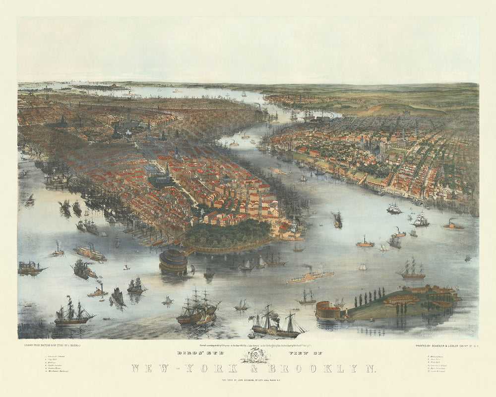 Además de su precisión geográfica, el mapa incluye una leyenda que enumera 12 puntos clave de interés, como el Ayuntamiento, la Aduana y la Bolsa de Comerciantes. Estos puntos de referencia ofrecen una visión del corazón cívico y comercial de la Nueva York de mediados del siglo XIX y brindan contexto a la bulliciosa vida representada. La inclusión de calles y caminos, desde Broadway hasta Wall Street, permite a los espectadores navegar por el paisaje histórico, rastreando los caminos que han dado forma a la historia de la ciudad. Este nivel de detalle hace que el mapa no sólo sea una hermosa obra de arte sino también una valiosa herramienta para comprender el tejido urbano de Nueva York y Brooklyn.