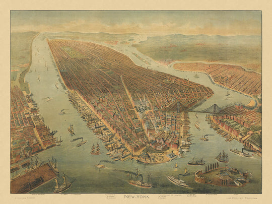 Los ríos East y Hudson enmarcan el mapa, enfatizando el estatus de Nueva York como una bulliciosa ciudad portuaria. Las vías fluviales están repletas de barcos, ilustrando el papel de la ciudad como una puerta de entrada al mundo. Esta actividad marítima subraya la vitalidad económica que ha definido a Nueva York durante mucho tiempo, convirtiéndola en un centro de comercio y cultura. El mapa captura la esencia de una ciudad en constante movimiento, donde la innovación y la tradición coexisten.
