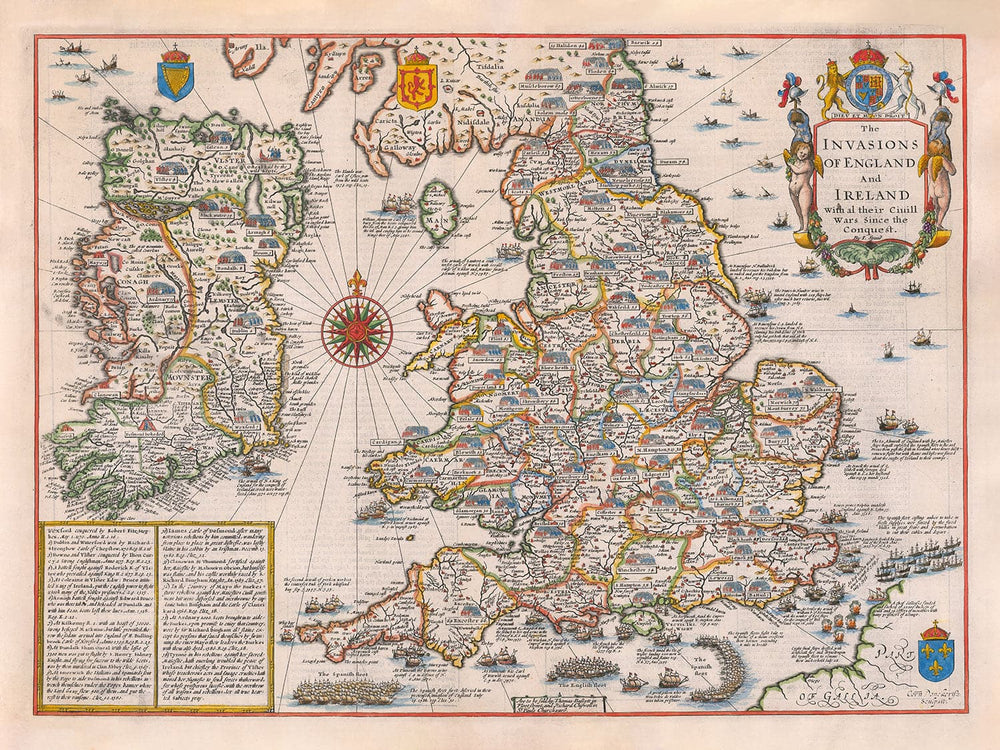Este intrigante y fascinante mapa de invasiones fue elaborado magistralmente por Cornelius Danckerts en 1676, pero se basa en el mapa original de Inglaterra e Irlanda de John Speed de 1611.