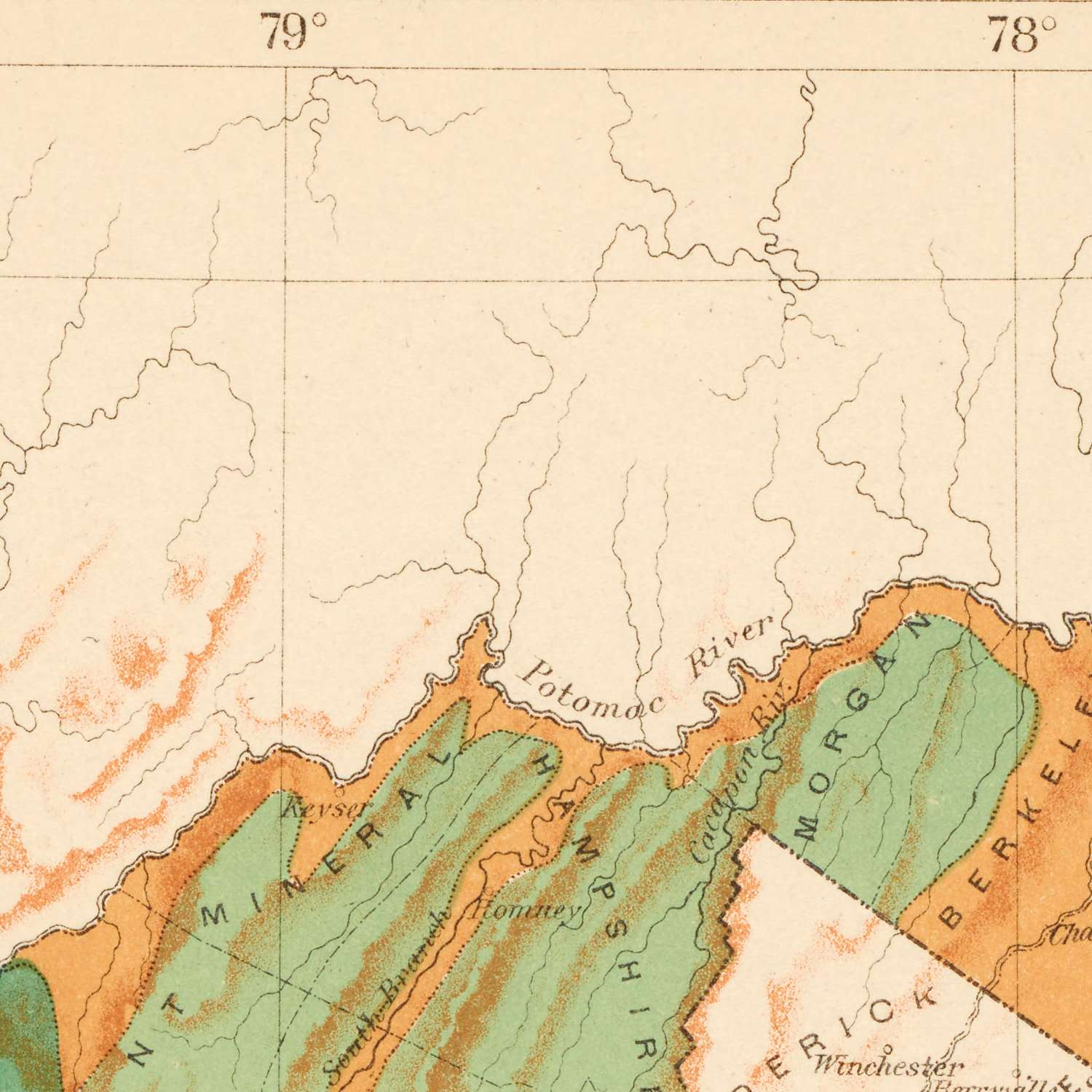Against this physiographic stage, the map positions West Virginia’s rising towns and corridors of trade. Charleston anchors the Kanawha valley’s hardwood reserves; Huntington, born of rail and river, channels timber down the Ohio; Wheeling and Parkersburg stand as older river entrepôts; Morgantown and Fairmont, on the Monongahela, knit upland forests to northern industry; and Weirton marks the narrow Panhandle’s conduit to Pittsburgh markets. Areas of reduced forest cover are candidly shaded where axes, farms, and mines converged along bottoms and tilled benches. The calibrated scale and county detail allowed lumbermen to estimate tracts and routes, even as reformers read the same symbology as an early warning, hinting at the costs of unchecked extraction.