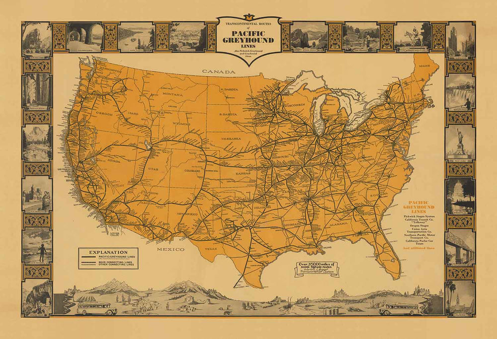 Un mapa en profundidad que muestra las rutas de Greyhound Lines en los Estados Unidos en 1935. Se muestran las tres principales redes: Pacífico, Principal y Otras Líneas.