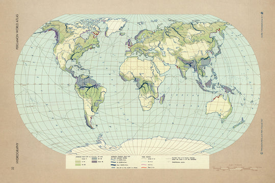 Este mapa de Hidrografía Mundial de 1967, publicado por el Servicio de Topografía del Ejército Polaco, es una infografía fascinante y visualmente impresionante que presenta una gran cantidad de datos sobre los recursos hídricos del mundo. El enfoque principal del mapa es la hidrografía, incluyendo escorrentía, ríos y rango de mareas a nivel global.
