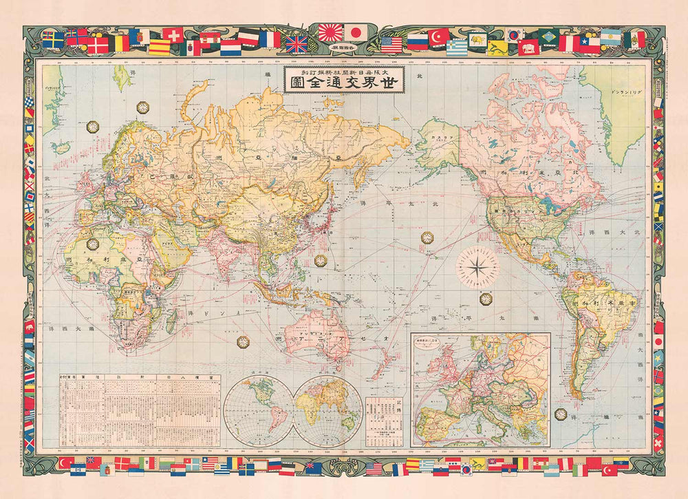 Este mapa es muy detallado, ya que incluye las rutas marítimas internacionales y las líneas ferroviarias nacionales y transcontinentales. En el borde del mapa aparecen las banderas de las principales naciones del mundo.