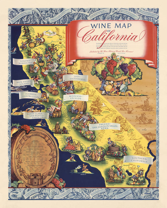 El diseño y el estilo del mapa ofrecen una visión del contexto histórico de la década de 1930, mostrando el resurgimiento de la industria del vino después de los restrictivos años de la Prohibición. Las ilustraciones no sólo resaltan las regiones geográficas sino que también representan las actividades culturales y las tradiciones asociadas con la elaboración del vino, proporcionando un rico tapiz de información y deleite visual. El enfoque lúdico pero informativo del mapa lo convierte en una pieza valiosa para comprender el panorama histórico y cultural de la industria vitivinícola de California.
