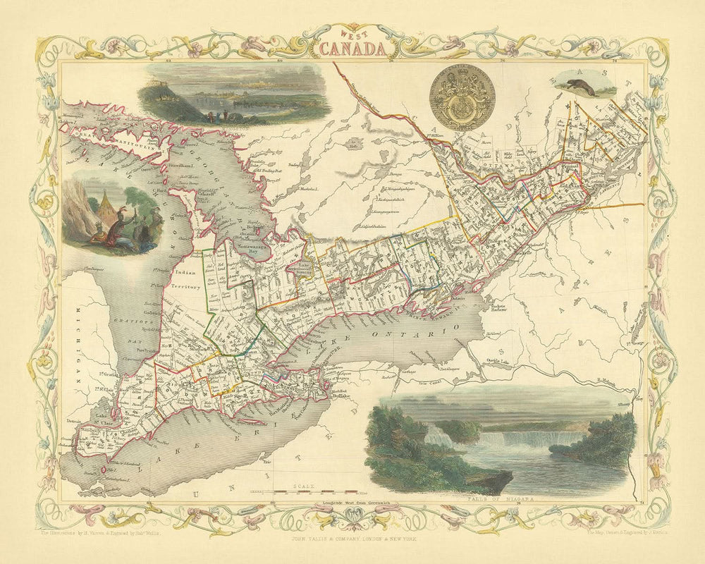 Mapa antiguo de 'Canadá Occidental' por Tallis, 1851: Toronto, Cataratas del Niágara, Lago Erie, Kingston, Viñetas