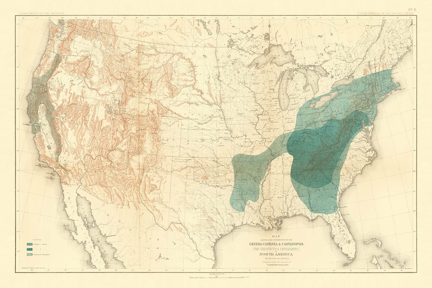 - Name of the map: Map Showing the Distribution of the Genera Castanea & Castanopsis (The Chestnuts & Chinquapins) in North America Exclusive of Mexico.