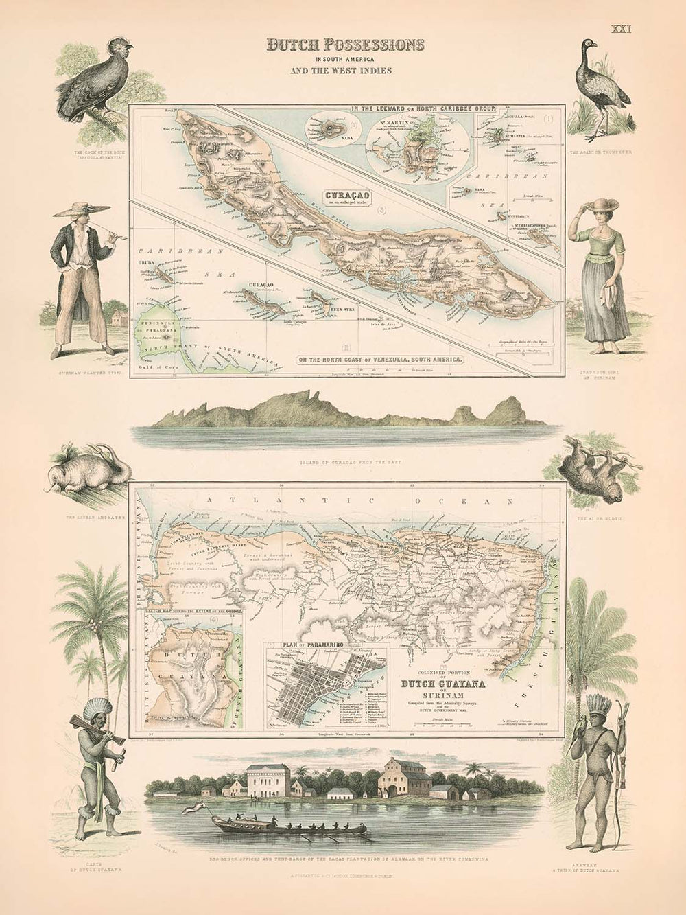 Archibald Fullarton & Co. was renowned for their commitment to precision and artistry in mapmaking, and this piece is a testament to their legacy. The publisher’s attention to detail is evident in the map’s decorative flourishes and its inclusion of elaborate illustrations. Most notably, the map features a large, evocative view of the Residence Offices and Tent-Barte of the Cacao Plantations of Alkmaar on the River Commewina, as well as a picturesque vista of Curaçao as seen from the east. These vignettes provide not only visual delight but also a tangible connection to the economic and architectural realities of Dutch colonial enterprise.