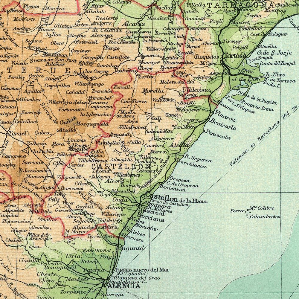 The northeast is rendered with exquisite relief: the Pyrenees crest in serried tints, their higher summits pricked by spot heights that hint at the drama of passes descending toward Barcelona and Tarragona. The Ebro River carves its grand valley, fans into a marshy delta near the Mediterranean, and underwrites the agricultural wealth of Aragon and Catalonia. Southward, the Valencian littoral unfurls past Castellón de la Plana and Valencia to the capes of the Costa Blanca, with the Turia and Júcar rivers threading irrigated huertas behind the shore. Coastal contours and bathymetry together explain the siting of harbors and roadsteads, while a net of shipping distances clarifies Barcelona’s role as a Mediterranean relay between Iberia, France, and Italy.