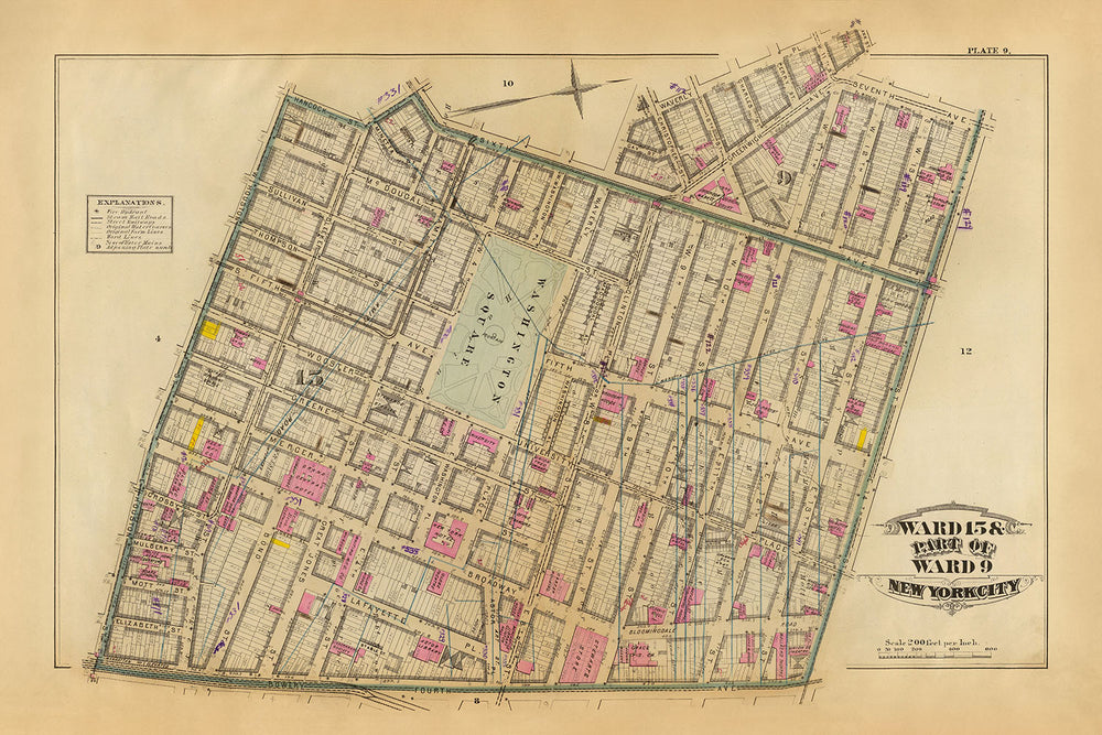 El estilo del mapa es indicativo de los estándares cartográficos de la época, y el coloreado a mano mejora la distinción visual de varias características. Estos mapas fueron esenciales para la planificación urbana, la evaluación inmobiliaria y la gobernanza local, y hoy nos ofrecen una ventana a la vida cotidiana de los neoyorquinos del pasado. También delinea las dimensiones del bloque, lo que puede ser una comparación fascinante con el paisaje urbano moderno tanto para historiadores como para entusiastas.