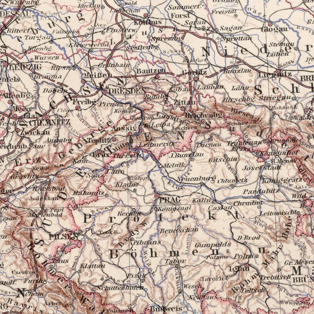 The design language is quintessentially Stieler: hachured relief shaping the Alps, Sudetes, and Carpathians with almost sculptural nuance; gradated outline colors clarifying sovereignty; and a disciplined symbology for railways, roads, and waterways. The legend anchors interpretation at the foot of the sheet, while blue-ink text and indices provide an immediate, navigable key to a thicket of toponyms. Political boundaries are cut with crisp exactitude, yet never at the expense of physical geography, whose prominence reminds the reader that every frontier sits upon an older landscape. The result is a visual equilibrium—orderly, legible, and rigorously observed—that underscores the map’s documentary authority.