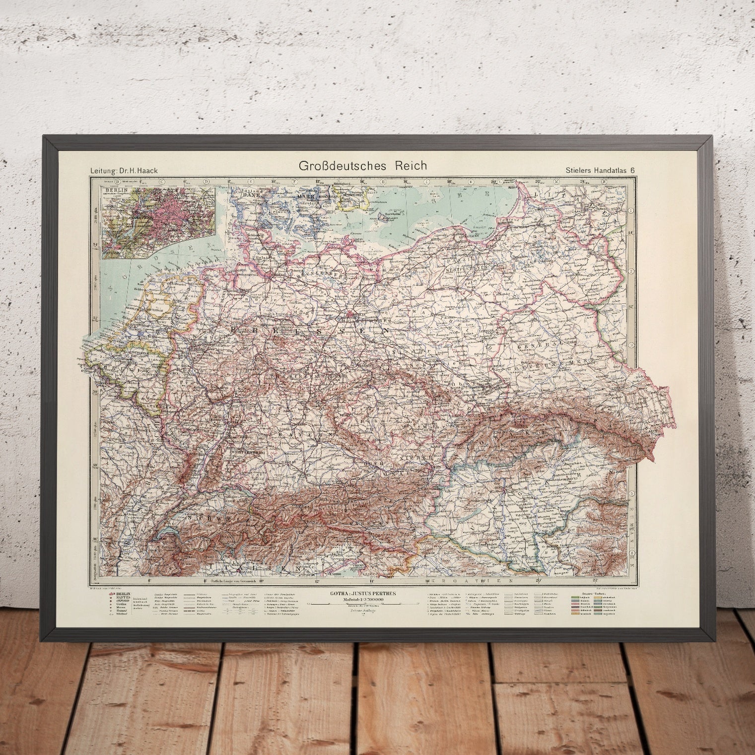 Rare Old Map of Grossdeutsches Reich & Central Europe by Stieler, 1944: Berlin inset; WWII borders