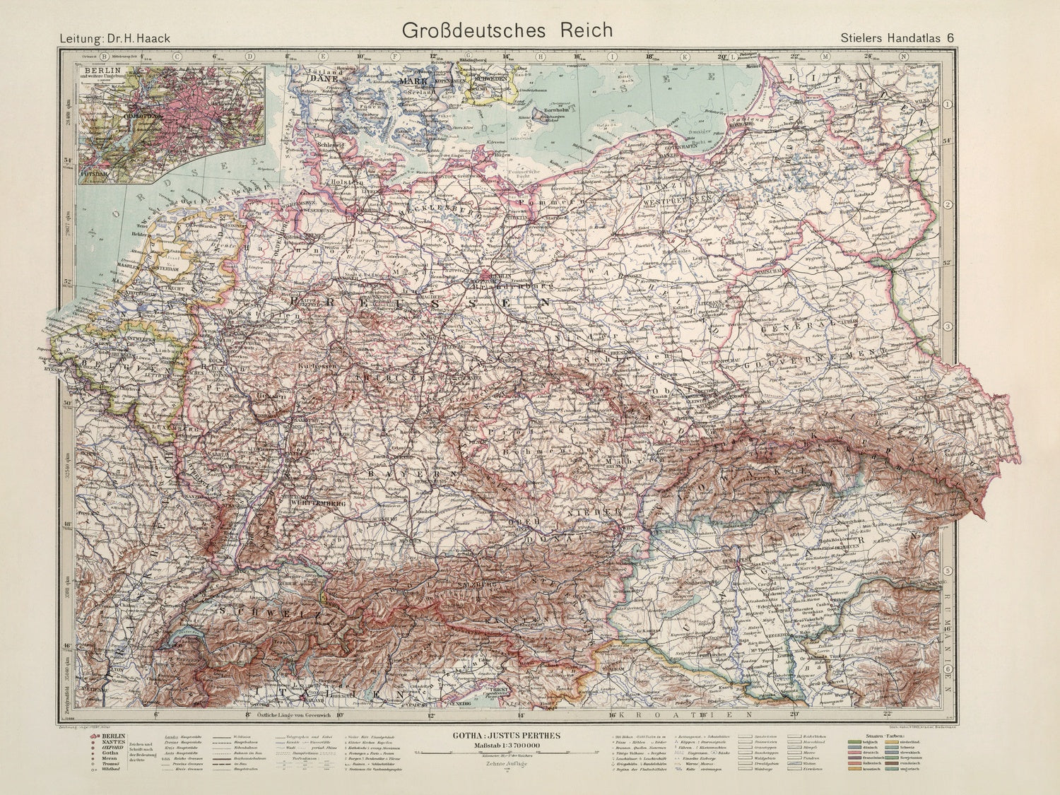Grossdeutsches Reich is the stark and resonant title of this late-war sheet from the storied Stieler tradition, a meticulously engraved view of Central and Eastern Europe at the very brink of epochal change. Prepared in 1944 and issued in the final months of World War II, it marries outline color with crisp blue-ink indexing to clarify an otherwise tangled political landscape. Relief is rendered through disciplined hachures, giving mountain chains, river valleys, and uplands a tactile presence that anchors the map’s political assertions in palpable terrain. An inset of Berlin in the upper left concentrates attention on the Reich’s beating heart, while the main field unfurls a dense web of borders, routes, and place-names whose precision belies the turmoil they record.