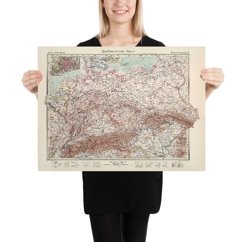 Culturally and intellectually, the sheet stands at the intersection of scientific cartography and ideological assertion. Its balanced, mid-latitude projection privileges clarity across the Central European theater, while its toponymy and borderwork reflect the political claims of the year it depicts. The Berlin inset functions almost as a cartographic epilogue: an intense compression of urban form, transport threads, and administrative detail that foreshadows the city’s postwar centrality. Rare and definitive within the Stieler lineage, Grossdeutsches Reich invites close reading—of terrain and territory, of design and power—offering a pivotal, unsettling, and profoundly instructive document from the last moments of a collapsing world order.