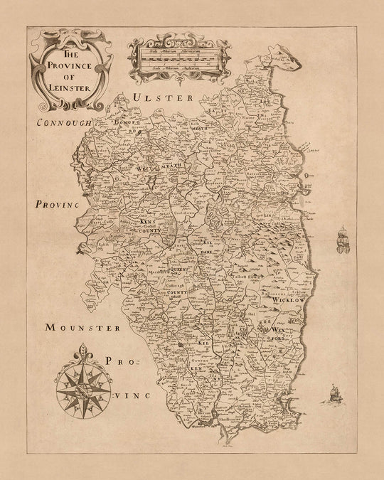 Este mapa de Leinster, publicado originalmente en 1685 por Sir William Petty, es un mapa político y físico detallado que proporciona una gran cantidad de información sobre la región. El mapa se basa en el Down Survey de Irlanda, que fue la primera encuesta de tierras detallada a escala nacional en cualquier parte del mundo. La encuesta fue dirigida por Petty, quien era cirujano general en el ejército inglés y una figura prominente en el campo de la economía política.