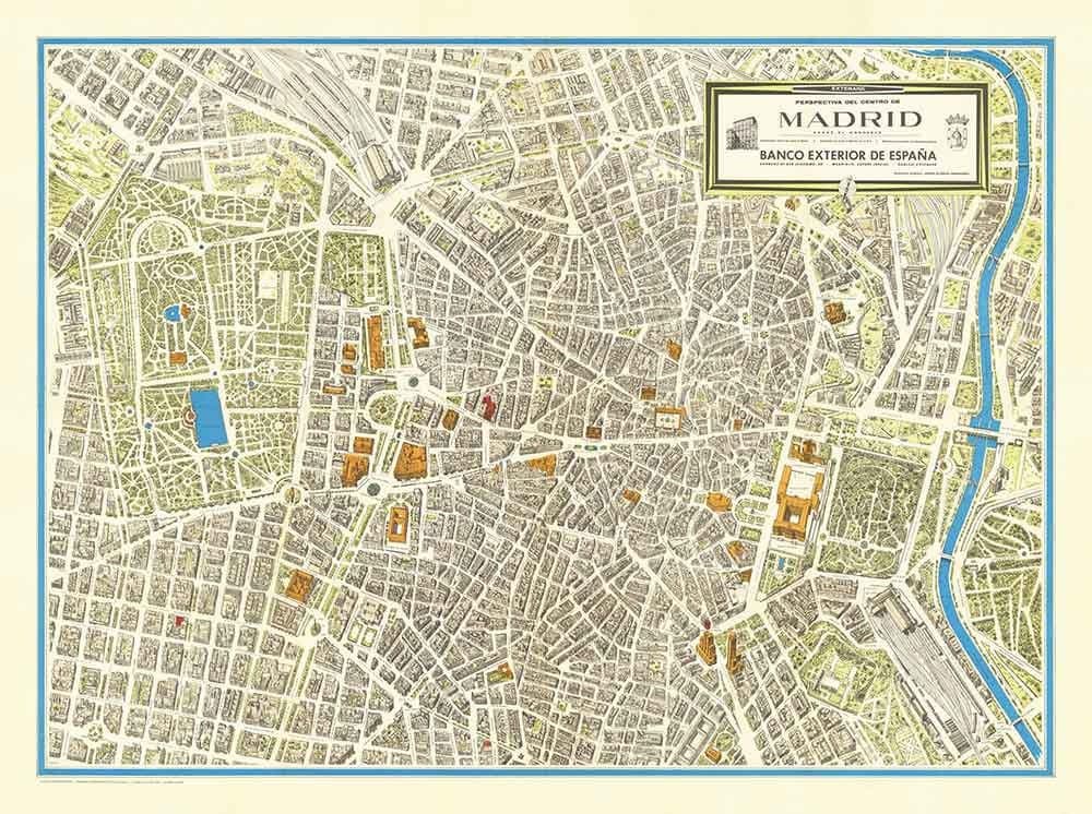Un mapa raro y hermoso de Madrid publicado originalmente en 1966 por Jorge Guzmán Hernández. Este mapa está dibujado en un estilo isométrico para que puedas ver los maravillosos detalles y la arquitectura de los edificios emblemáticos de Madrid.