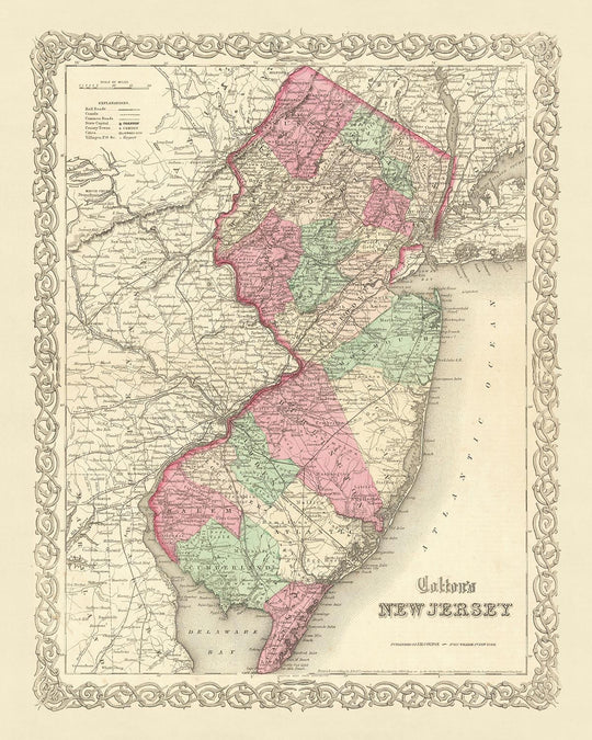 Este mapa ofrece una instantánea fascinante de Nueva Jersey a mediados del siglo XIX, un período en el que Estados Unidos todavía se encontraba en sus primeras etapas de desarrollo. Muchos de los asentamientos que conocemos hoy aún no se habían fundado, y los nombres y fronteras que ahora nos resultan familiares han sufrido cambios significativos en los últimos 150 años. Esto hace que el mapa no sólo sea una hermosa obra de arte, sino también un valioso documento histórico que proporciona información sobre la evolución del paisaje americano.