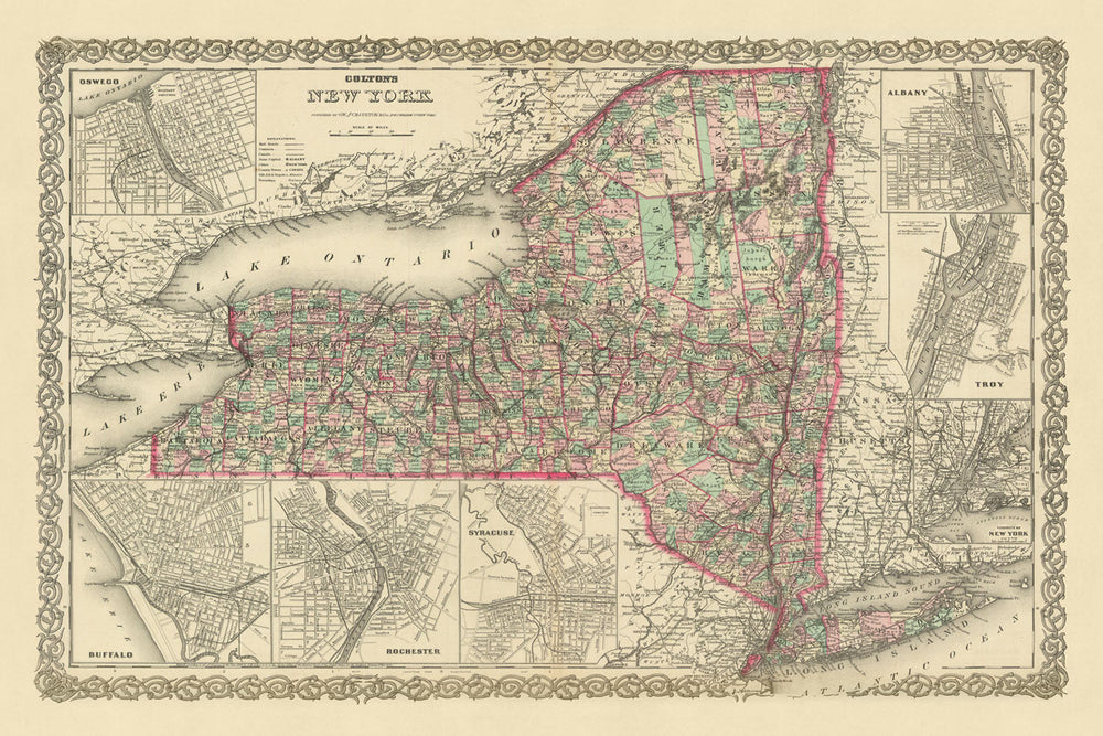 A mediados del siglo XIX, muchos de los asentamientos que conocemos hoy aún no se habían fundado, y las fronteras y los nombres de los que existían probablemente hayan cambiado significativamente. Por lo tanto, este mapa no sólo sirve como una hermosa obra de arte sino también como un documento histórico fascinante, que traza el crecimiento y desarrollo de uno de los estados más poblados de los EE. UU.