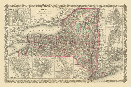 El mapa destaca cinco asentamientos notables que existían en Nueva York en 1855. Estos incluyen la ciudad de Nueva York, que ya era una metrópolis bulliciosa, Buffalo, una puerta de entrada clave hacia el oeste, Rochester, un centro industrial emergente, Albany, la capital del estado, y Syracuse. un centro vital de transporte y fabricación. Cada asentamiento está minuciosamente detallado y proporciona una gran cantidad de información sobre los primeros paisajes urbanos de estas ciudades.