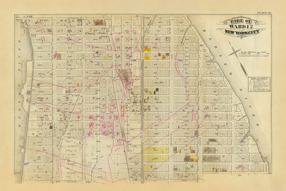 El mapa muestra de forma destacada los bulliciosos barrios del Distrito 12, una zona que ha sufrido una importante transformación a lo largo de los siglos. Delinea los límites de las propiedades y los edificios con una precisión notable, lo que ofrece información sobre los patrones de planificación y desarrollo urbano de la época. La inclusión de avenidas importantes como Broadway, 7th Avenue y 8th Avenue destaca la importancia de la zona como centro comercial y residencial, mientras que la representación detallada de calles como W. 135th St. y W. 145th St. ofrece una ventana a la vida cotidiana de sus habitantes.