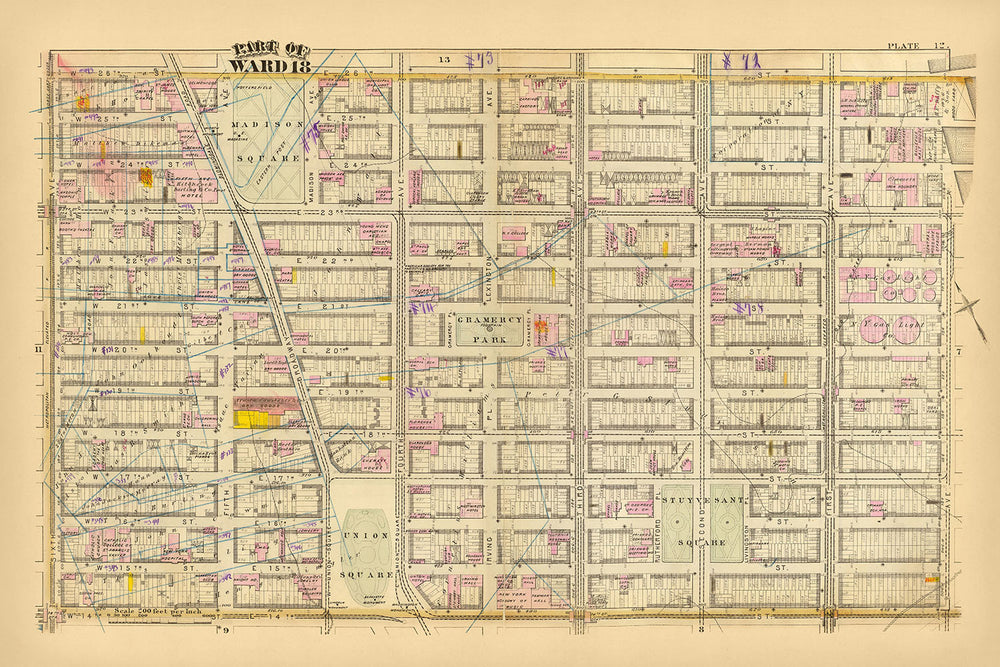 El mapa presenta de manera destacada Madison Square, Gramercy Park, Stuyvesant Square, Union Square y el famoso Tammany Hall, cada uno de ellos un hito con su propio pasado histórico. Madison Square, por ejemplo, fue un epicentro de la vida social, mientras que Union Square sirvió como lugar de reunión para manifestaciones públicas. Gramercy Park, con su jardín privado vallado, ejemplifica los enclaves exclusivos de la ciudad. Stuyvesant Square habla de las raíces coloniales holandesas de la ciudad y Tammany Hall de su intriga política.