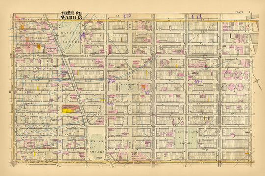Este mapa meticulosamente detallado, coloreado a mano y litografiado, fue publicado por GW Bromley en 1879 y proporciona una instantánea histórica del Distrito 18 de la ciudad de Nueva York. En ese momento, el mapa habría sido una herramienta esencial para los funcionarios, residentes y empresas de la ciudad por igual. , que ofrece información sobre el paisaje urbano, desde las huellas de los edificios hasta la ubicación de las bocas de incendio y las tuberías de agua. Su representación de calles, ferrocarriles y plazas públicas no sólo refleja el espacio físico sino también la vitalidad de la vida urbana del siglo XIX en Nueva York.