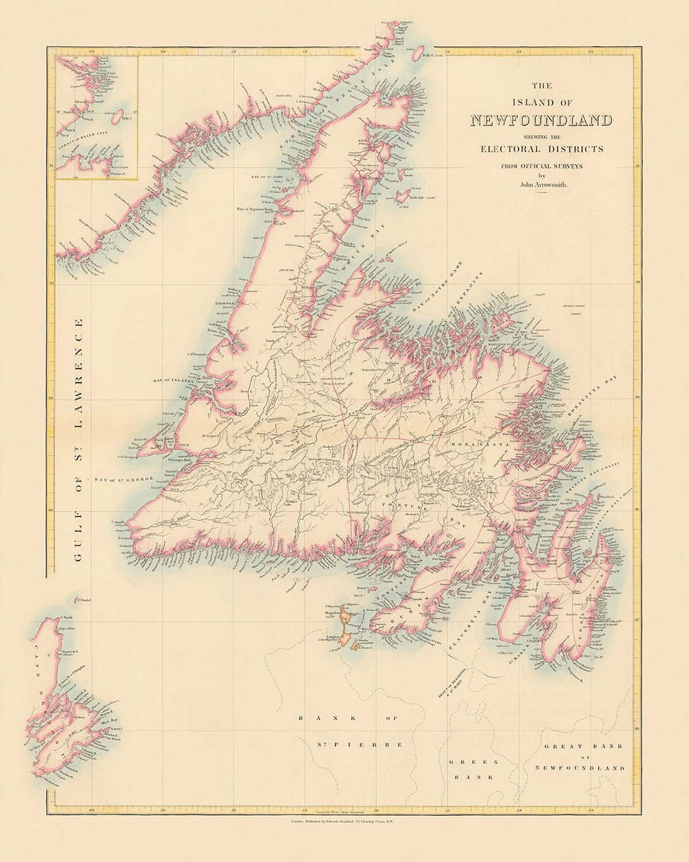 Mapa antiguo de Terranova por Arrowsmith, 1884: St. John's, Gran Banco, Bahía Trinity, Ríos, Distritos Electorales